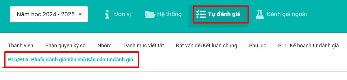 Bước 1: Vào menu Tự đánh giá → chọn tab PL5/PL6. Phiếu đánh giá tiêu chí / Báo cáo tự đánh giá
