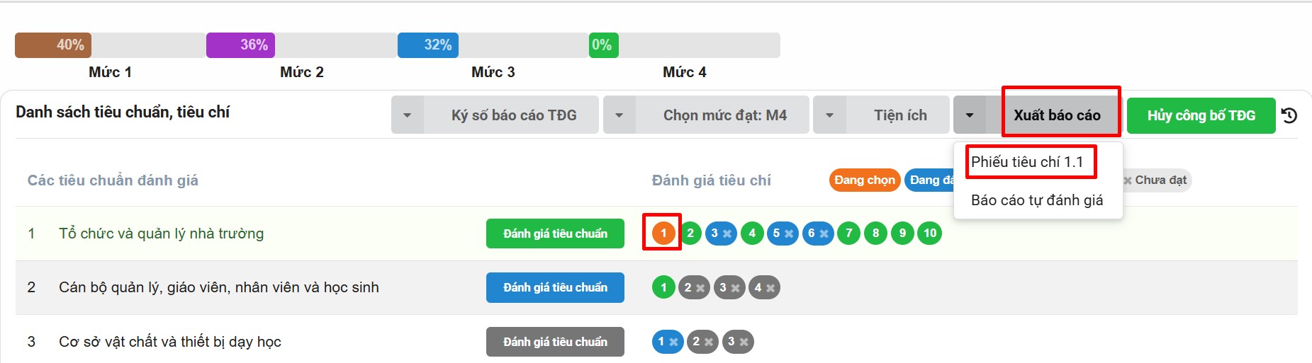 Bước 2: Chọn tiêu chí muốn xuất phiếu → bấm vào nút Xuất báo cáo → chọn tùy chọn Phiếu tiêu chí....