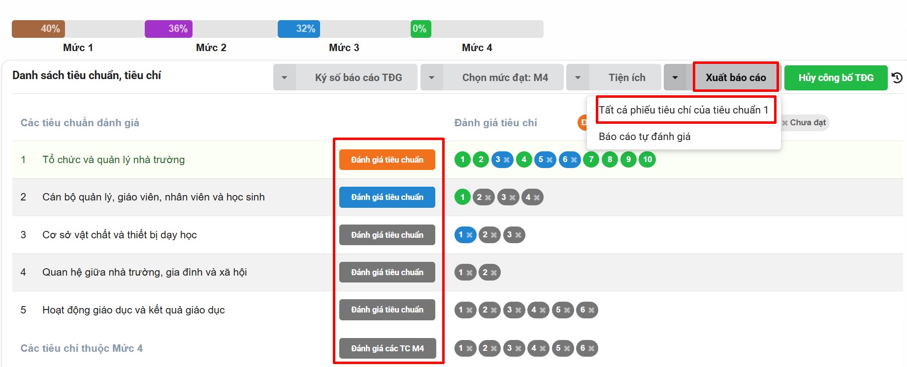 Nếu muốn xuất 1 lần các tiêu chí trong tiêu chuẩn thì Thầy/Cô bấm Đánh giá tiêu chuẩn, sau đó bấm nút Xuất báo cáo -> chọn Tất cả phiếu tiêu chí của tiêu chuẩn...