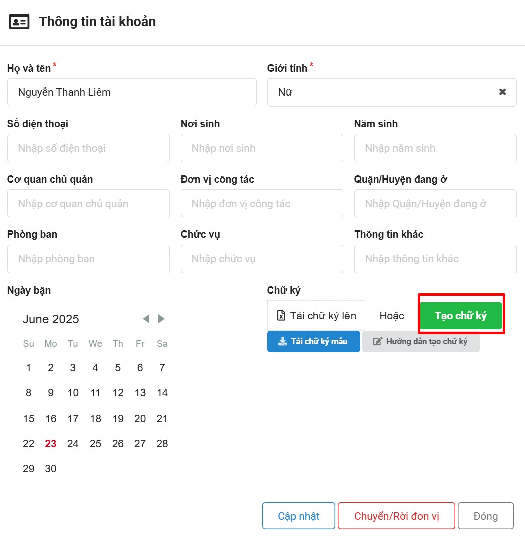 Chữ ký điện tử là yếu tố quan trọng trong quy trình tự đánh giá, đánh giá ngoài để ký các báo cáo điện tử. Tính năng Cập nhật chữ ký giúp các thành viên được phân quyền có thể tạo hoặc tải lên hình ảnh chữ ký của mình để sử dụng trong ký số trên phần mềm.