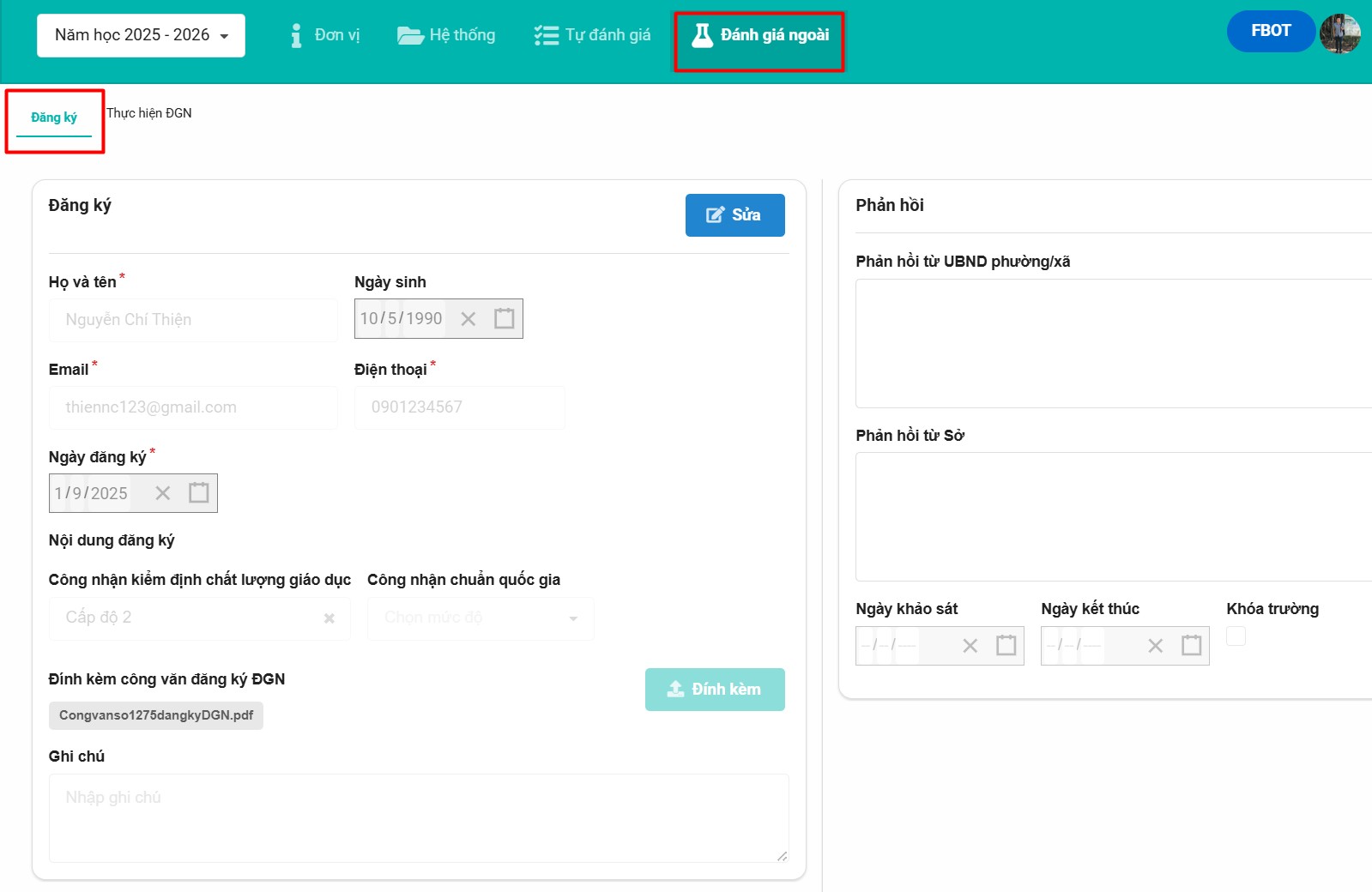 Tính năng Đăng ký đánh giá ngoài (ĐGN) giúp nhà trường gửi thông tin đề nghị được kiểm định chất lượng giáo dục hoặc công nhận đạt chuẩn quốc gia lên cấp trên. Đây là bước cần thiết để cấp trên bố trí đoàn đánh giá ngoài đến khảo sát, đánh giá chính thức.