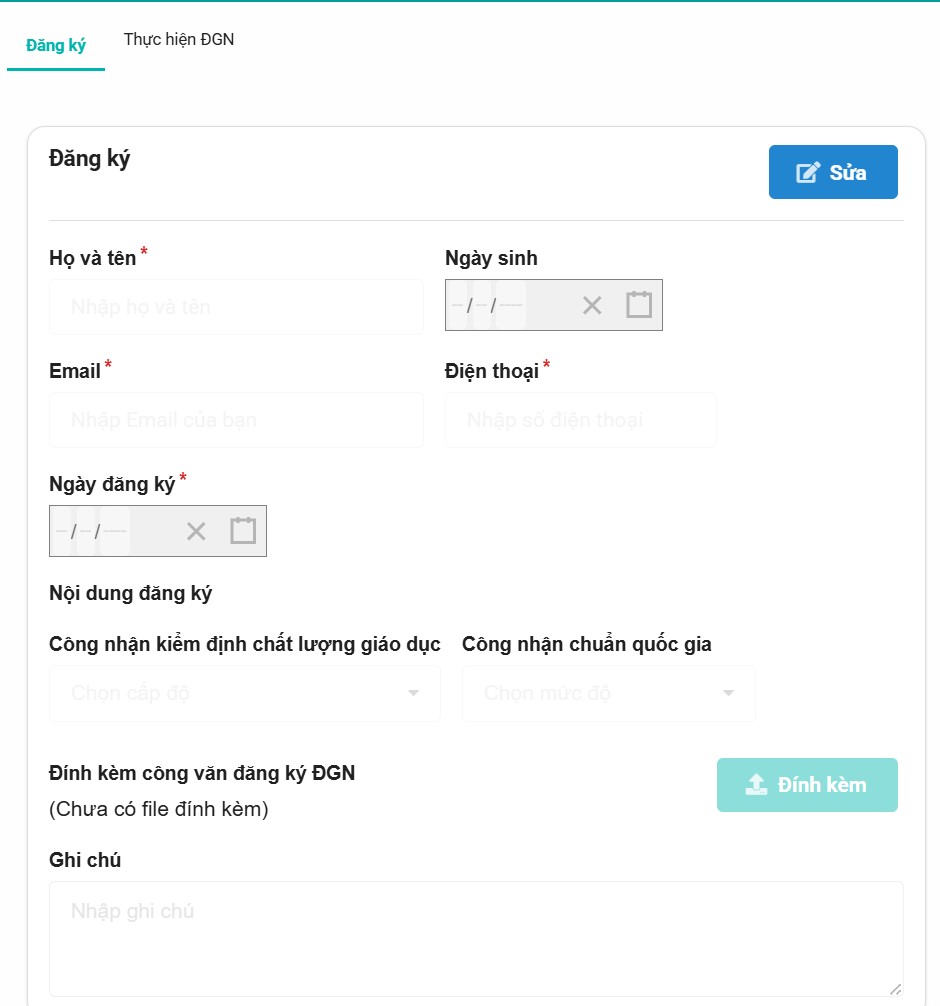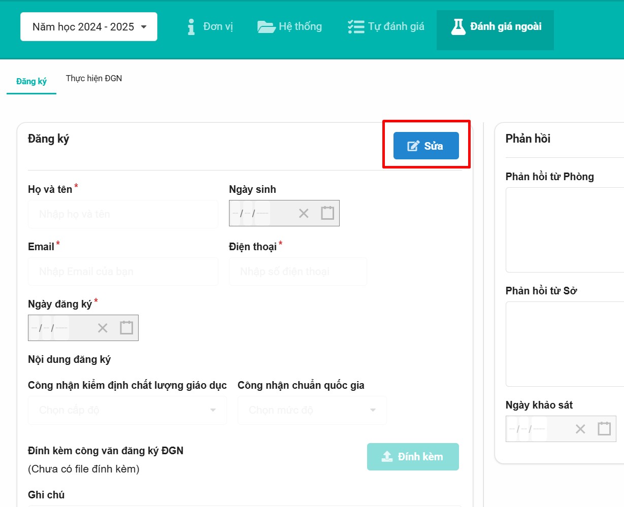 Lưu ý: Chỉ tài khoản quản trị mới có quyền đăng ký đánh giá ngoài.