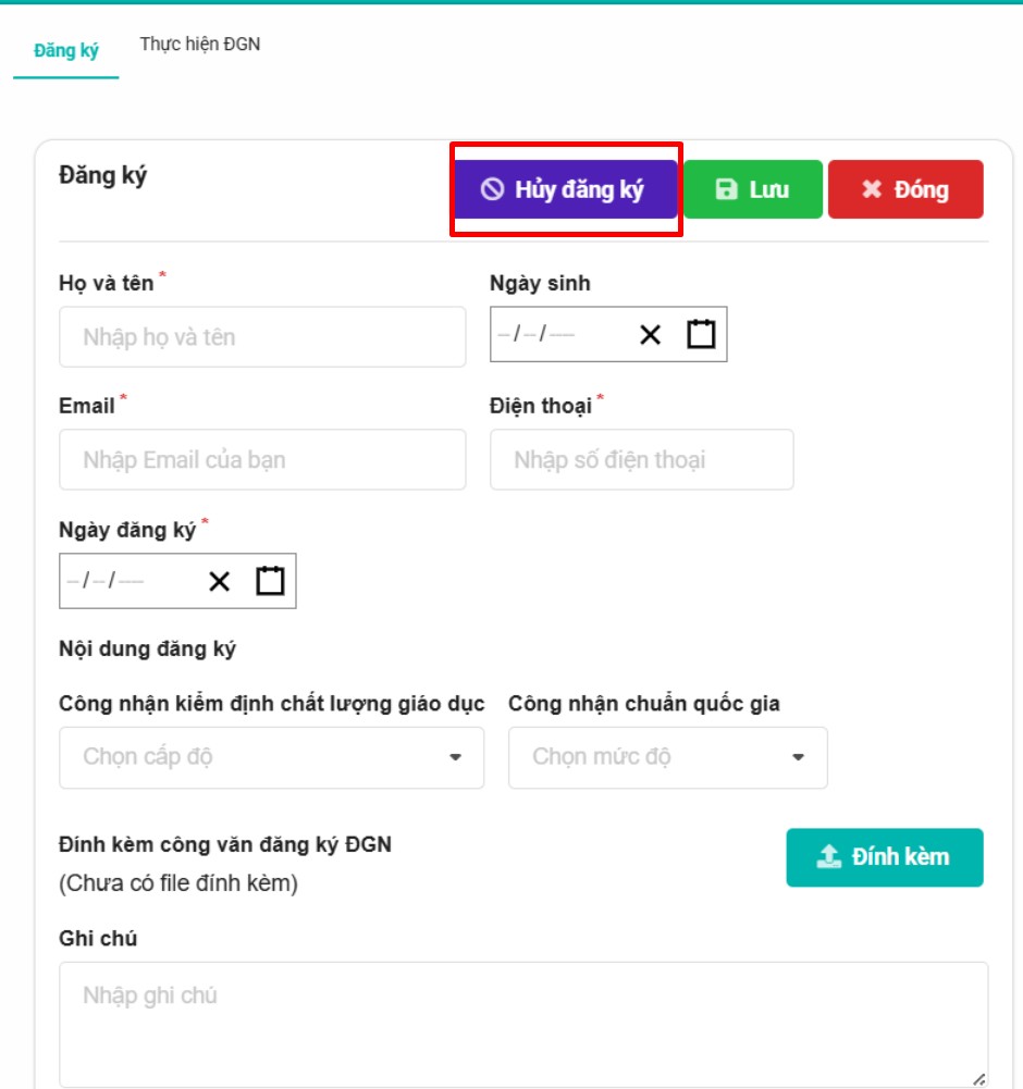 Nếu nhà trường muốn rút lại đăng ký đã gửi, bấm nút “Hủy đăng ký”. Sau khi hủy, trạng thái đăng ký sẽ trở về như ban đầu và cấp trên sẽ không tiếp nhận hồ sơ nữa.