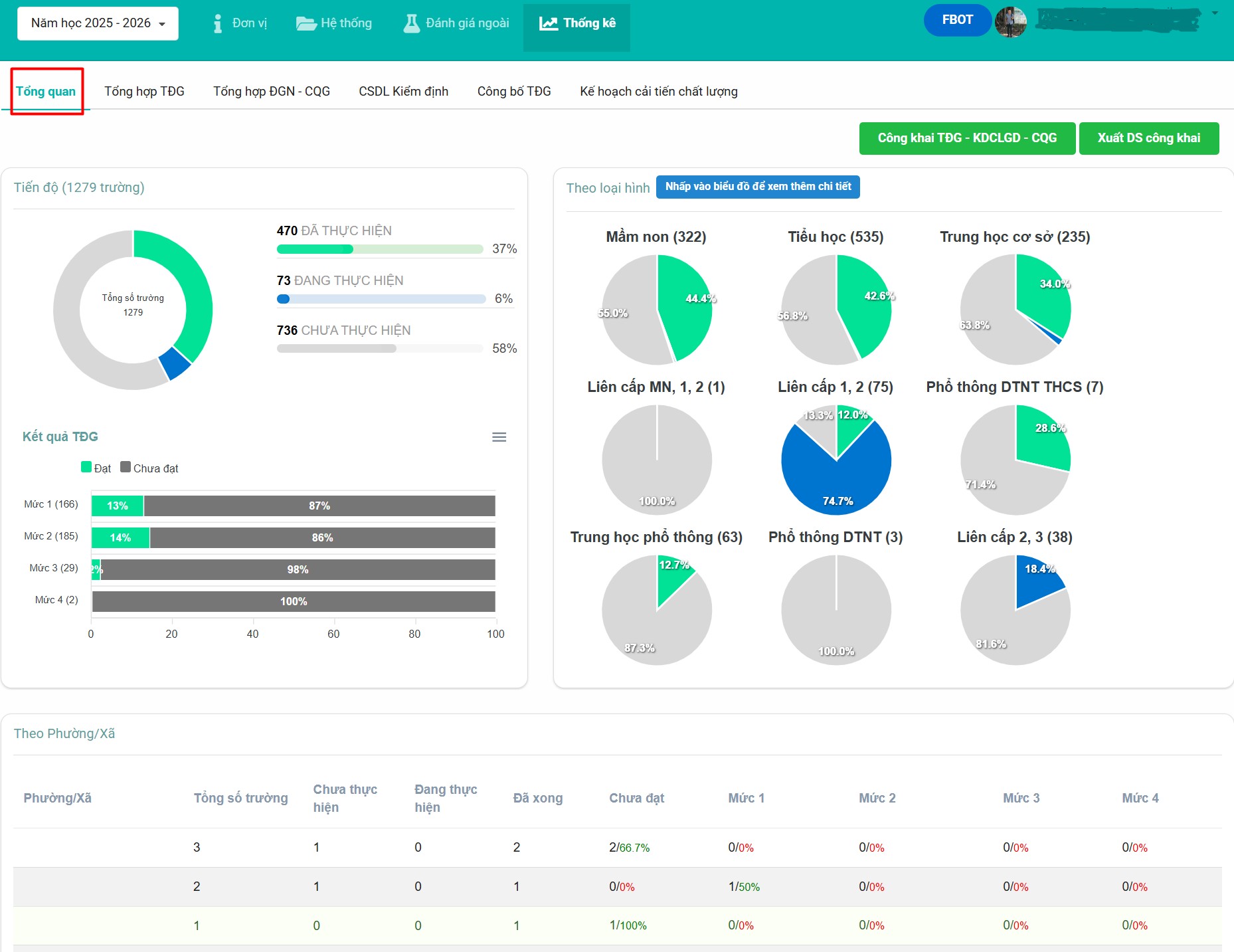 Nếu Thầy/Cô ở cấp Sở, bên dưới sẽ hiện thêm danh sách các phường/xã để tiện theo dõi tình hình triển khai.