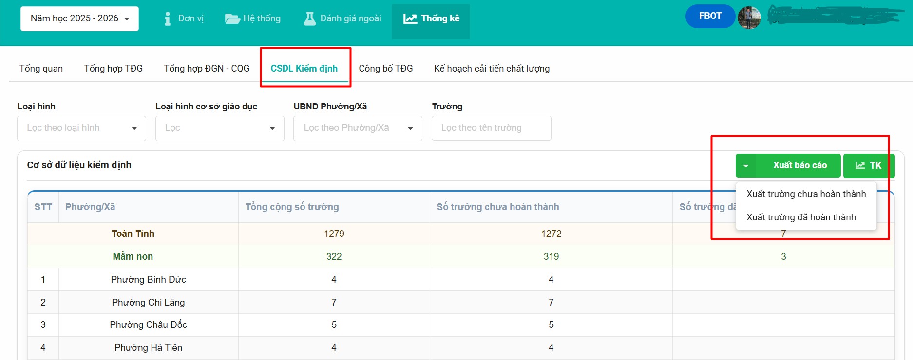 - Tương tự như trên, hỗ trợ xuất danh sách trường theo trạng thái hoàn thành của kế hoạch tự đánh giá.