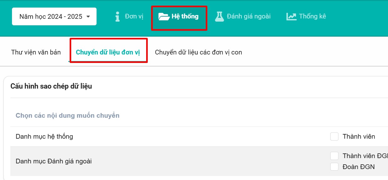 Bước 1: Vào menu Hệ thống → chọn tab Chuyển dữ liệu đơn vị