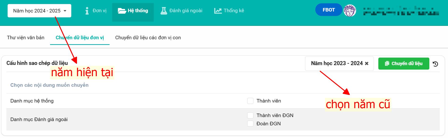 Giúp Thầy/Cô tại cấp Sở dễ dàng sao chép dữ liệu từ năm học cũ sang năm học mới để tiết kiệm thời gian, không cần nhập lại thủ công. Các nội dung có thể sao chép bao gồm: danh sách thành viên trong đơn vị Sở, thành viên Đoàn đánh giá ngoài (ĐGN), và dữ liệu tự đánh giá của các đơn vị trường học.