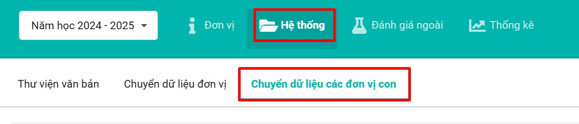 Bước 1: Vào menu Hệ thống → chọn tab Chuyển dữ liệu các đơn vị con