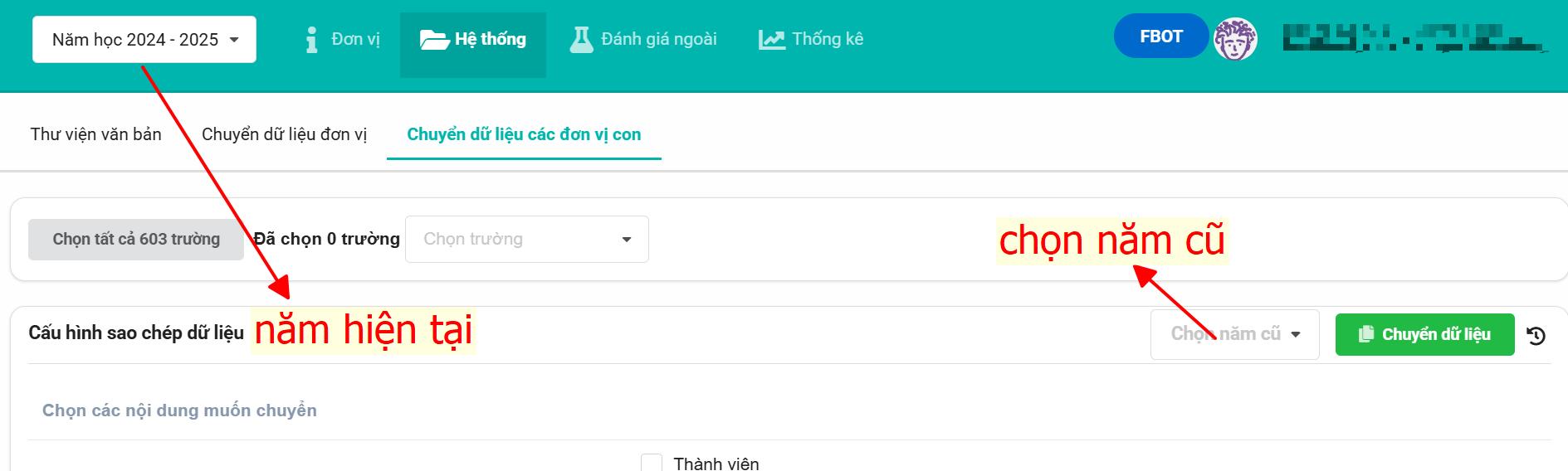 Bước 2: Chọn năm cũ – tức năm học đã có dữ liệu đầy đủ mà Thầy/Cô muốn sao chép sang năm hiện tại
