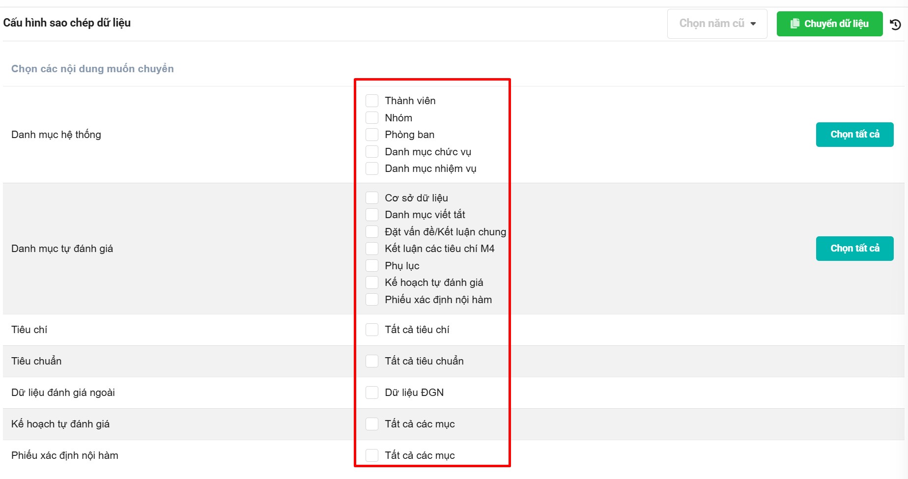Thông thường, Thầy/Cô nên chọn tất cả để đảm bảo dữ liệu được chuyển đầy đủ sang năm học mới.