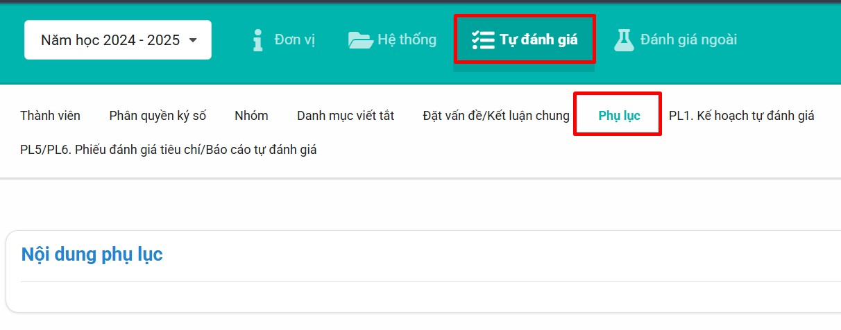 Bước 1: Vào menu Tự đánh giá → chọn Phụ lục