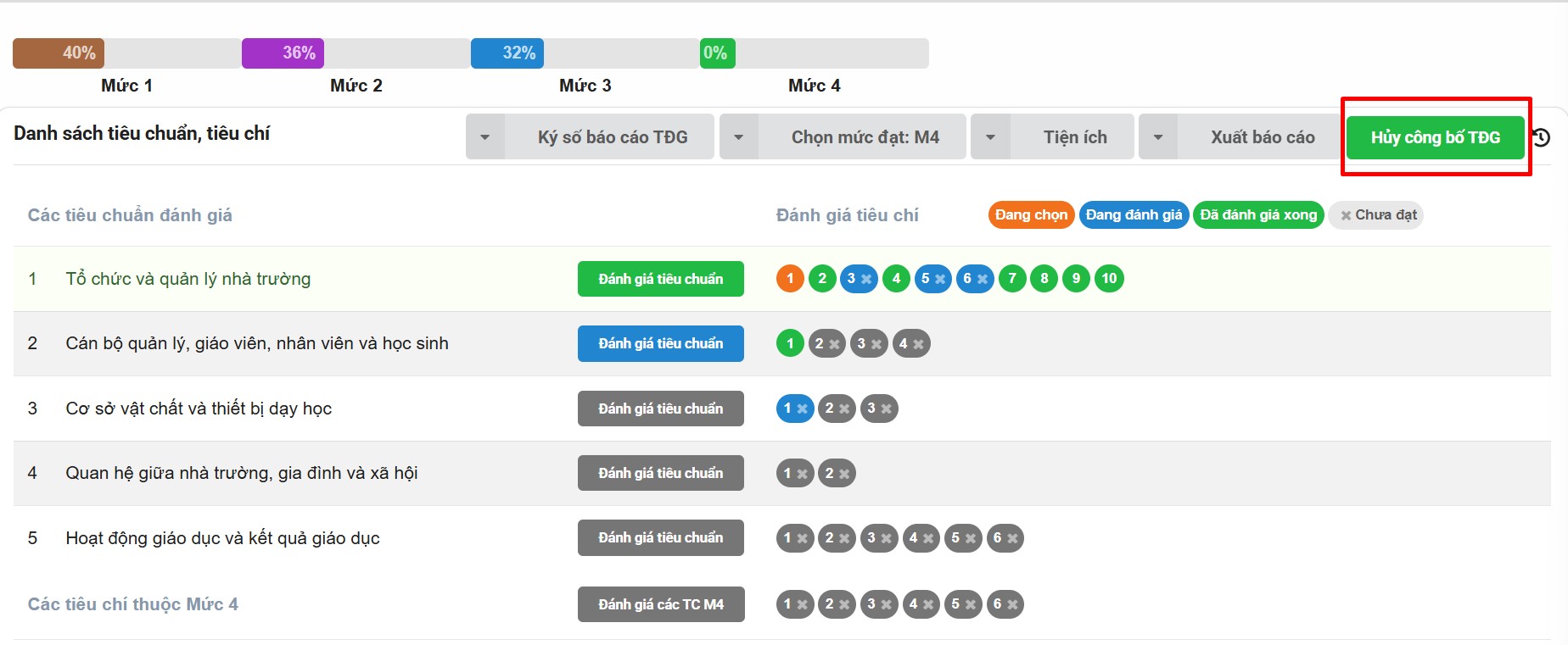 Nếu nhà trường phát hiện sai sót sau khi công bố và muốn chỉnh sửa lại, Thầy/Cô cần bấm vào nút Hủy công bố TĐG để mở khóa dữ liệu. Sau khi chỉnh sửa xong, thực hiện Công bố lại.